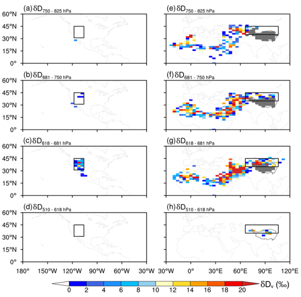 图2.夏季美国西部和亚洲干旱区不同层水汽稳定同位素出现“反高程效应”的空间分布格局