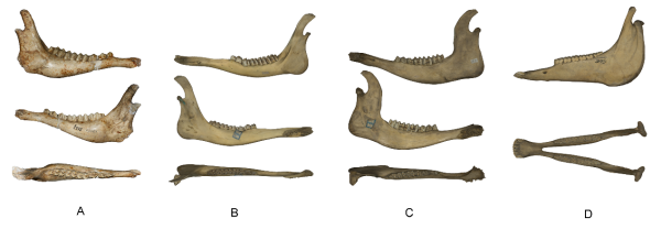 图1 肿骨中华大角鹿(A),驼鹿(B),水牛(C)和家马(D)的下颌骨