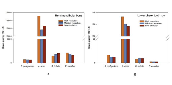 图2 各物种下颌骨(A)和下颊齿列(B)应变能