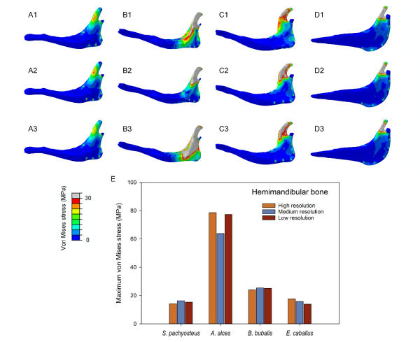 图3 各物种下颌骨的Von Mises应力云图(A-D分别为肿骨中华大角鹿,驼鹿,水牛,家马)和去除前2%的最大von Mises应力(E)