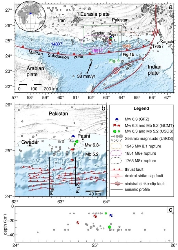 莫克兰俯冲带是全球俯冲带的端元代表:超低的俯冲角度(2-3°)、超厚的俯冲沉积物(高达7.5公里)和超宽的增生楔(超过400公里)。莫克兰俯冲带历史上大地震多发,最近的1945年Mw 8.1级大地震还触发了海啸,造成大约4000人死亡。由于该俯冲带的地质构造独特、历史地震记录不全、国际上针对该区域的调查研究相对较少,目前对于其大地震机理、同震形变和海啸特征等知之甚少。2017年,在莫克兰东部海域Pasni地区发生了一次Mw 6.3级地震事件(图1),为回答以上问题提供了契机。该地震是继1945年Mw 8.1地震以来该区发生的最大地震,而且该地震有较好的现今地质、地球物理和大地测量等数据覆盖,研究2017年Mw 6.3级地震为揭示莫克兰俯冲带的强震和海啸机理提供了关键途径。