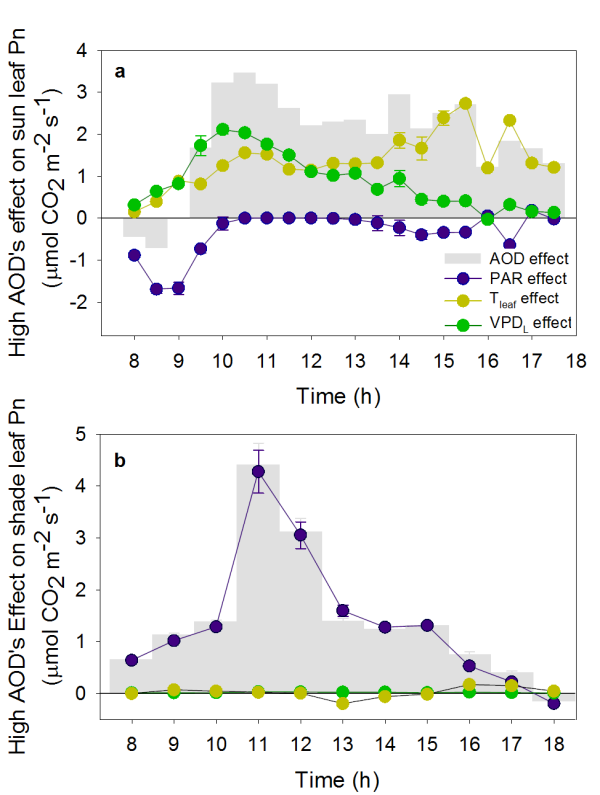中国科公司植物研究所刘玲莉研究组以中国北方广布树种杨树为研究对象,利用北京地区气溶胶浓度周期性波动,开展了长期定位观测实验,以揭示气溶胶对阳生叶和阴生叶光合作用日动态的影响及其调控机理。该研究在生长季晴朗无云的天气下进行,分别观测不同气溶胶浓度下的阳生叶和阴生叶的光合作用日动态,同时监测气溶胶光学厚度以及叶片温度、叶片接收的光合有效辐射、叶片与大气间的饱和水汽压差(VPDL)等叶片微环境。结果表明,气溶胶同时促进阳生叶和阴生叶的光合作用,但对阳生叶光合作用的促进作用主要发生在正午和下午;而对阴生叶光合作用的促进则贯穿整个白天。结合光合作用机理模型,研究进一步发现,气溶胶对阳生叶光合的促进作用主要是通过缓解高温和高VPDL对光合速率的抑制来实现;对于阴生叶,提高光合作用主要是通过缓解冠层内部的弱光抑制来实现,且正午前后的效应最强。