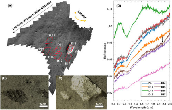 图1.LMS光谱数据的测量视场如红框所示(A),全景相机展示了月壤(B)、石块的影像(C)和LMS反射光谱曲线(D)。(A)红框显示了LMS光谱数据的观测视场,其中D11为石块,D14-D16为铲取后的月壤光谱。月壤和石块放大的影像如(B)、(C)所示,(D)展示了经过辐射定标、热校正等预处理后的反射光谱曲线。