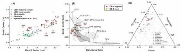 1μm和2μm的吸收特征的光谱参数图(图2A)显示,随着钙含量增加,辉石在1μm和2μm的吸收位置向长波方向移动,CE-5着陆点的月壤和石块为高钙辉石,这在1μm吸收中心和2μm与1μm吸收面积比值投图(图2B)得到进一步证实。本研究利用Hapke模型和稀疏解混算法反演得到原位光谱的矿物成分及其丰度,反演结果与CE-5样品的分析结果以及轨道遥感的反演结果一致(图2C)。