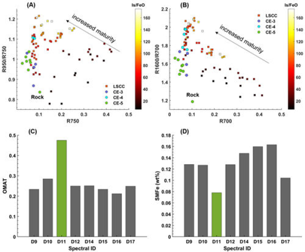 太空风化是无大气天体上由微陨石撞击和太阳风注入引起的光谱红化和暗化的普遍现象。研究利用光谱斜率R950/R750和R1600/R700分别与R750与R700的投图定性分析CE-5着陆点月壤的成熟度(图3A、B),发现与CE-4着陆点月壤相比,CE-3和CE-5着陆区的月壤相对更不成熟,这可能与CE-3和CE-5着陆于年轻的撞击坑溅射毯(<100 Ma)上有关。研究进一步计算了光学成熟度(OMAT,图3C)和亚微观铁(SMFe,图3D)含量,发现火箭吹扫前后及铲取前后月壤成熟度没有发生显著变化,表明CE-5着陆区月壤在铲取深度(<3cm)以内经历过等效的暴露历史。这与Apollo钻取样品的放射性核素分析结果以及月壤翻耕模型模拟结果相吻合。该研究为月壤表层经历了快速翻耕和充分混合作用提供了光谱证据。