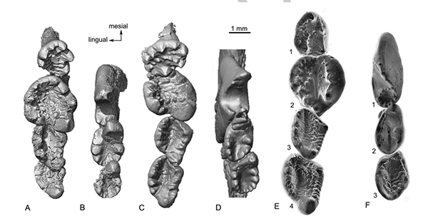 图1.三类贼兽左侧上下齿列对比,其中E-F齿列中的牙齿曾经归入四个属种