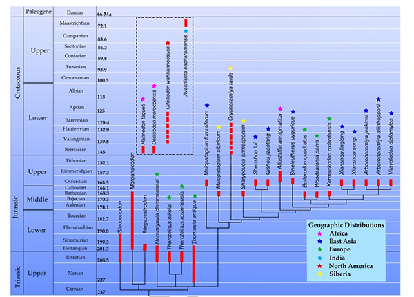 图2.现有贼兽种级系统发育分析及地理分布