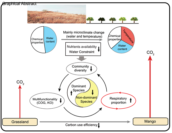 山地未来研究中心常年致力于农林复合系统构建与全球气候变化间的关系研究,并对农林复合系统下的土壤生态效应和可持续性等进行了追踪研究。该中心依托红河农林复合生态云南省野外科学观测研究站,通过对干热河谷退化地和改造地间的长期土壤温室气体定点监测,以及不同样地土壤样本理化及生物动态分析,发现从退化地到农田的转变主要通过降低土壤含水量以及养分有效性对于微生物生长的约束,进而引起土壤微生物群落结构的重组并导致微生物群落及功能多样性显著降低。同时,这种土地利用变化对土壤特征和微生物群落的影响也降低了微生物功能多样性和碳利用效率,导致了土壤微生物功能代谢变化,呼吸作用加剧,进而引起土壤CO2排放的增加。由于该研究中观察到的土壤微生物多样性和多功能性下降的类型可能会严重影响改造地土壤功能的可持续性,下一步研究应该探索和制定缓解本区域土地利用变化导致的土壤碳流失和进一步增加碳固存的土地管理措施。