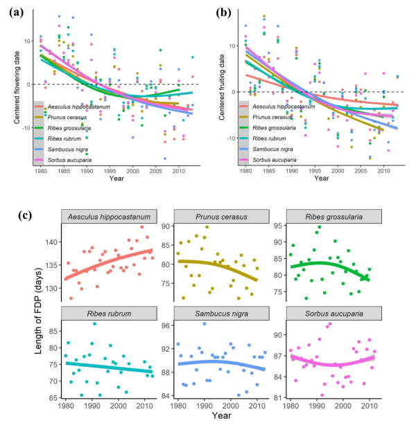中国科公司华南植物园生态中心副研究员马倩倩与合作者,利用历史物候观测资料(1980-2013年),分析了6种常见温带木本植物的开花和结果物候期和果实发育期时长对气候变暖的响应。研究发现,所有物种的开花和结果时间均随气候变暖而提前。相应地,整个果实发育期表现为前移趋势。然而,同一物种开花和结果时间的提前速率并不一定相等,使得果实发育期时长随变暖呈现三种不同变化——延长、缩短或不变。这与植物生长季随变暖普遍延长的现象不同。果实发育期的差异化响应表明植物对于气候变暖采取了不同的繁殖物候响应策略,由此可能会改变物种适应性,进而影响森林生态系统结构和功能。