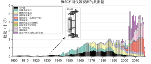 19世纪末,挪威物理海洋学家Fritjoff Nansen将水银温度计装装入采水器来测量海水温度,这成为现代海洋观测起源的重要标志,被称为南森瓶(Nansen Bottle)。该仪器在20世纪被大量使用,至今累计超过200万条海洋温度廓线数据(图1)。