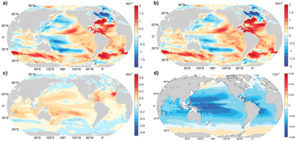 图2.1955-1990年,全球上层2000米海洋热含量趋势:a)为不订正采水器偏差;b)为订正采水器偏差;c)为a和b之差;d)为100-800米海洋的气候态平均温度梯度。