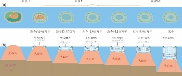 研究综合南沙美济环礁“南科一井”样品的锶、碳、氧同位素以及矿物学、微体古生物学、元素测试数据,分析探讨了美济环礁的形成和演化历史,将该珊瑚岛礁的演化划分为多个阶段,提出整个珊瑚岛礁的发育过程可用阶段性侵蚀-沉积模式来解释。研究表明,热带地区的许多珊瑚礁可能不会长期持续繁荣生长,发育过程中沉积间断较频繁出现甚至有时可能持续数个百万年。