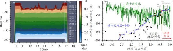 针对第四纪以来的珊瑚礁发育过程,研究对美济环礁上新世晚期(2.65Ma)以来的发育过程展开数值模拟研究,重建了礁体地层的沉积过程和泻湖的演变过程。研究表明,环礁的形成是因暴露时期的空间差异性岩溶而致的中间低、周缘高的地形,而非珊瑚和珊瑚礁在平台周缘的优先生长。泻湖内接近海平面的点礁的形成,是基于珊瑚和珊瑚礁在泻湖内地形高点之上的优先生长。该研究为全球环礁成因提供了新认识。