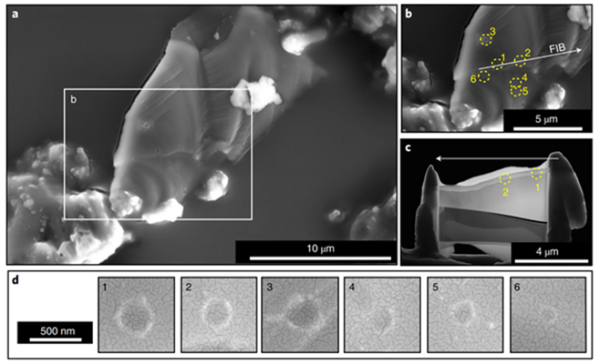 图1.a、d:嫦娥五号月壤铁橄榄石颗粒表面微型撞击坑的二次电子图像(Second Electron Image,SE);b、c:聚焦离子束(Focus Ion Beam,FIB)制备的微撞击坑超薄切片。