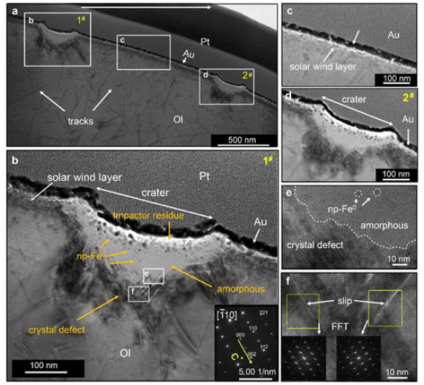 研究团队使用聚焦离子束对两个选定的微撞击坑制备了超薄切片,进一步的透射电镜(Transmission Electron Microscope,TEM)研究表明,这两个不同直径的微撞击坑具有相似的结构特征:撞击过程中惯性力产生的凹陷区和撞击坑;橄榄石在撞击体的动能产生的温度和压力作用下形成的非晶层;非晶层中np-Fe0含量丰富,浅层直径较大≈10 nm,深层直径较小≈3 nm;非晶区域边缘的单晶橄榄石的晶体结构中产生晶格缺陷;冲击延伸方向产生的附加非晶区;撞击坑周围存在溅射沉积物;表面覆盖的外来撞击体残余物。