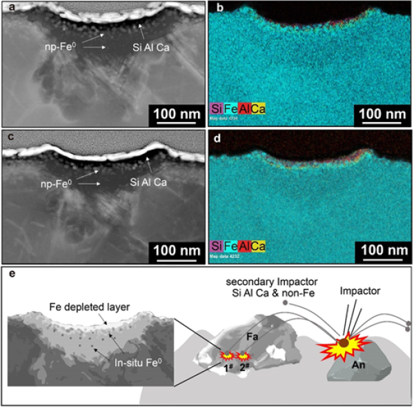 图3.a-d:超薄切片中两个微撞击坑的剖面结构与元素组成的透射电镜分析结果,证明表面分布有来自于斜长石质撞击体的残留组分;e:二次微撞击坑形成过程的示意图。