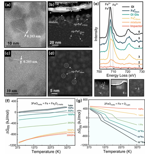 图4.a-e:微撞击坑底部橄榄石熔融层中不同粒径np-Fe0的晶面间距与电子能量损失谱分析结果;f-g:FeO发生歧化反应与分解反应的吉布斯自由能计算结果。