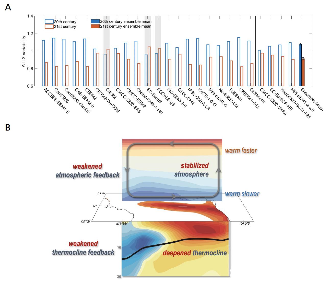 该研究采用CMIP6多模式数据和“国际高分辨率地球系统预测实验室”CESM–HR高分辨率耦合模式数据,发现了全球变暖将显著减小大西洋尼诺/尼娜变率和极端事件发生频率(图A)。全球变暖后,赤道大西洋大气层结变得更加稳定,减弱了赤道风场对东西方向SST梯度异常的响应;并且,赤道信风的减弱导致赤道东部温跃层加深,减小了SST对温跃层变化的响应。在两者共同作用下Bjerknes机制减弱,进而导致了大西洋尼诺/尼娜变率的减小(图B)。这一发现与太平洋和印度洋形成了鲜明的对比,在这两个海盆中厄尔尼诺/拉尼娜和强印度洋偶极子变率在变暖后显著增强。