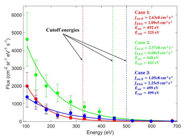 图2.嫦娥四号ASAN探测器看到的ENA能谱,其中Case1位于磁异常下游,Case2和Case3位于磁异常上游,用于分析磁异常对太阳风的减速和偏转作用