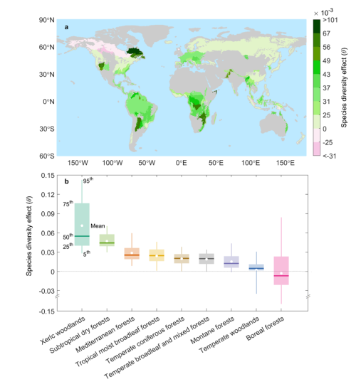 森林作为陆地生态系统的主体,在固碳增汇、应对气候变化等方面发挥重要作用。近年来,极端气候事件频发,削弱了森林碳汇功能,威胁着生态系统功能的稳定性。经典生态学理论预测,物种多样性越高,生态位互补效应越大,生态系统抵御外界环境胁迫的能力越强。然而,鲜有关于树种多样性高的森林能否有效抵御极端气候事件冲击这一问题的研究,既往研究集中在少数生态系统类型研究,缺乏对全球森林的整体认知。