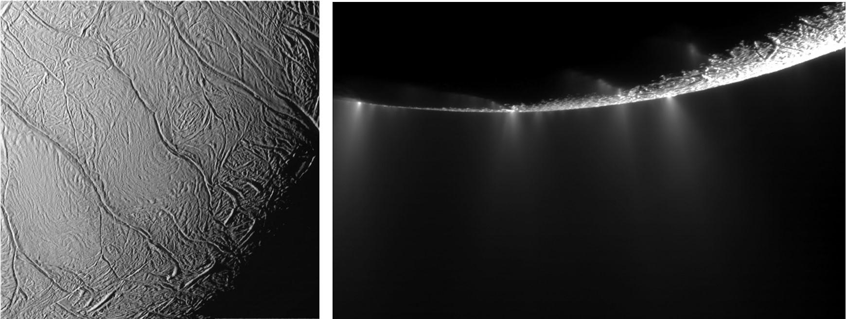 图1.卡西尼号观测到的土卫二冰壳上的老虎纹(左)和南极的水冰羽(右)
