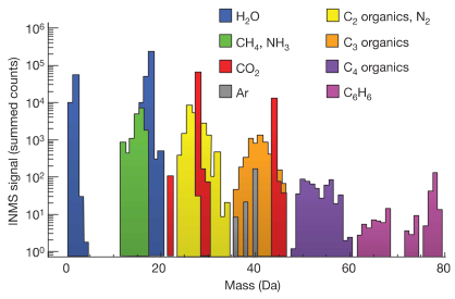 图2.2008年美国Cassini号对土卫二喷出物的分析(Waiteet al., 2009, Nature)