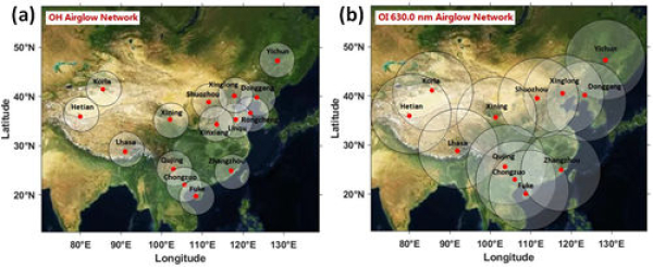 图1.双层气辉观测网:(a)OH气辉观测网,(b)氧原子红光(OI 630nm)气辉观测网。