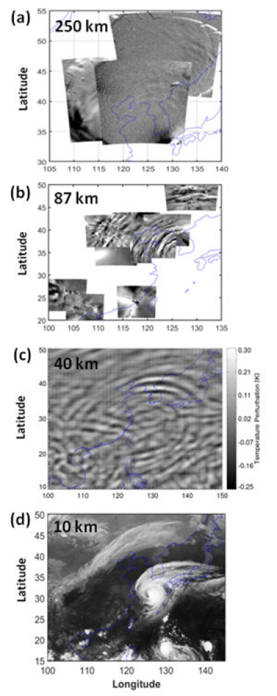 图2.台风Chaba激发的重力波的多层结构:(a)OI 630nm气辉(高度约250公里)观测网探测结果,(b)OH气辉(高度约87公里)观测网探测结果,(c)平流层40公里再分析温度扰动分布,(d)台风的对流层云图。