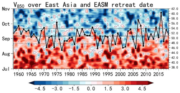 图1.1958年至2019年东亚夏季风撤退日期的时间序列以及(20°-40°N,120°-130°E)区域平均的850 hPa经向风风速(填色) 。