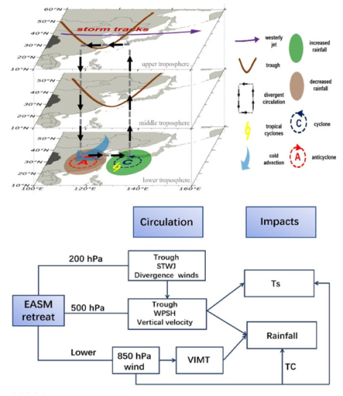 图2.总结图示:东亚夏季风撤退的对流层三维环流特征及主要影响