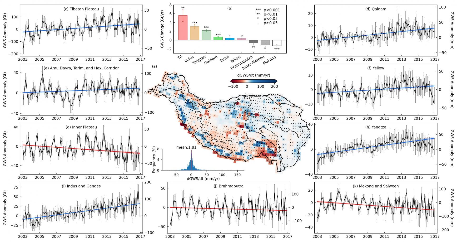以青藏高原为核心的“第三极”是除南极和北极以外冰雪储量最大的地区,被称为“亚洲水塔”,包括面积约十万平方公里的冰川、总面积约五万平方公里的湖泊和长江、黄河、雅鲁藏布江、印度河、恒河、湄公河、阿姆河、塔里木河等十余条亚洲大河的源头。“亚洲水塔”变化关系着中国的水资源利用以及“一带一路”地区众多国家的水安全。在全球气候变暖背景下,“亚洲水塔”正在发生以失衡为特征的诸如冰川加速退缩、湖泊整体显著扩张、冰川径流增加的剧烈变化。因此青藏高原地区一直是国内外科研的研究重点热点,关于其冷冻圈水文循环过程尤其是地下水受气候变化影响的研究更是国际前沿的科学研究问题。地下水作为旱季河流的重要来源,对于维系青藏高原脆弱的生态系统有着重要作用。研究气候变化如何影响青藏高原的地下水(储存在地下孔隙,裂隙和洞穴中的水)对于下游水安全和粮食生产至关重要。然而青藏高原地下水的研究长期受限于匮乏的观测资料,以往关于地下水储量变化的研究多集中在部分内流盆地,而且青藏高原地下水储量长期变化的主导因素尚不清晰,缺乏对青藏高原整体的全面分析。