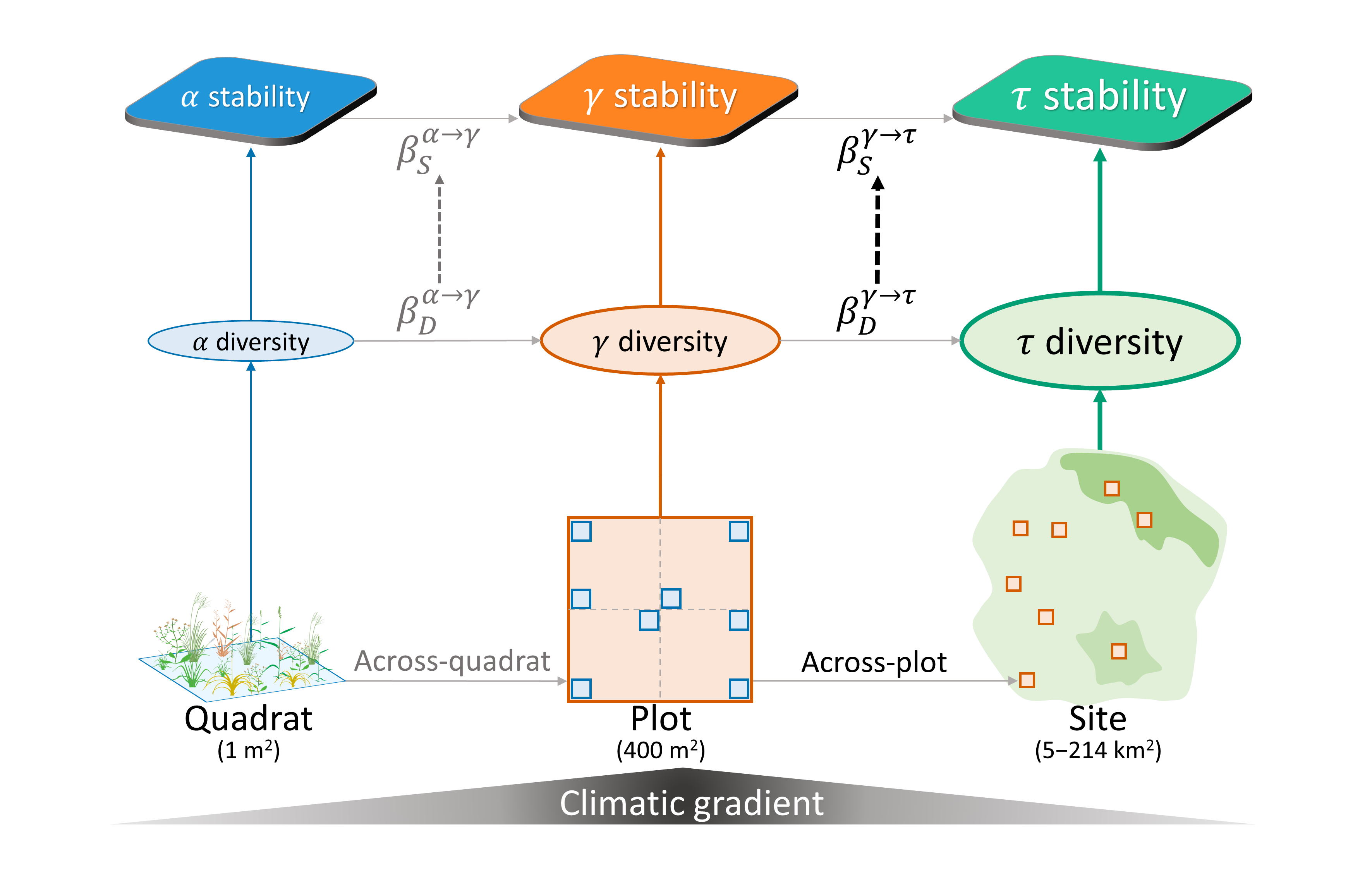 自然生态系统为人类社会提供了多种功能和服务。在全球变化背景下,维持生态系统的稳定性成为可持续发展的关键目标之一。很多研究表明,多样性越高的生态系统具有更大的稳定性。虽然“多样性-稳定性”理论自1990年代以来日趋成熟,但以往研究主要关注小尺度实验群落,关于这一理论能否扩展至大尺度自然群落仍不清楚。为了理解这一问题,北京大学城市与环境公司研究员王少鹏的研究组自2014年以来开展了一系列理论工作,提出并发展了多尺度稳定性理论框架,基于这一理论框架预测局域群落间的物种组成差异(即β多样性)可促进区域尺度生态系统的稳定性。针对这一理论框架,近期多项研究利用单个站点的植物群落实验数据做了检验,但跨区域的大尺度经验证据依然缺乏。