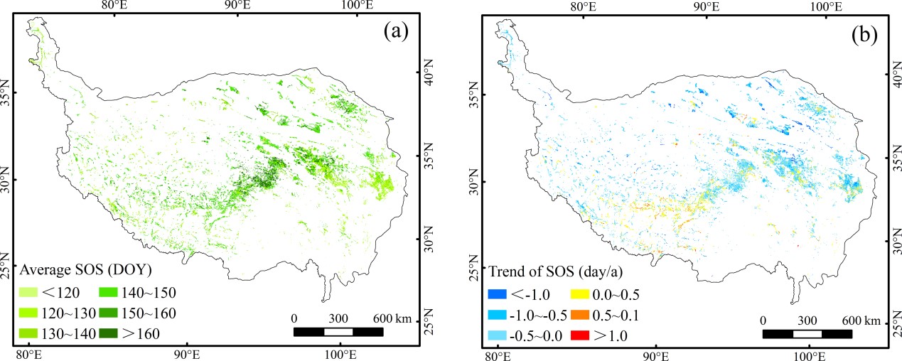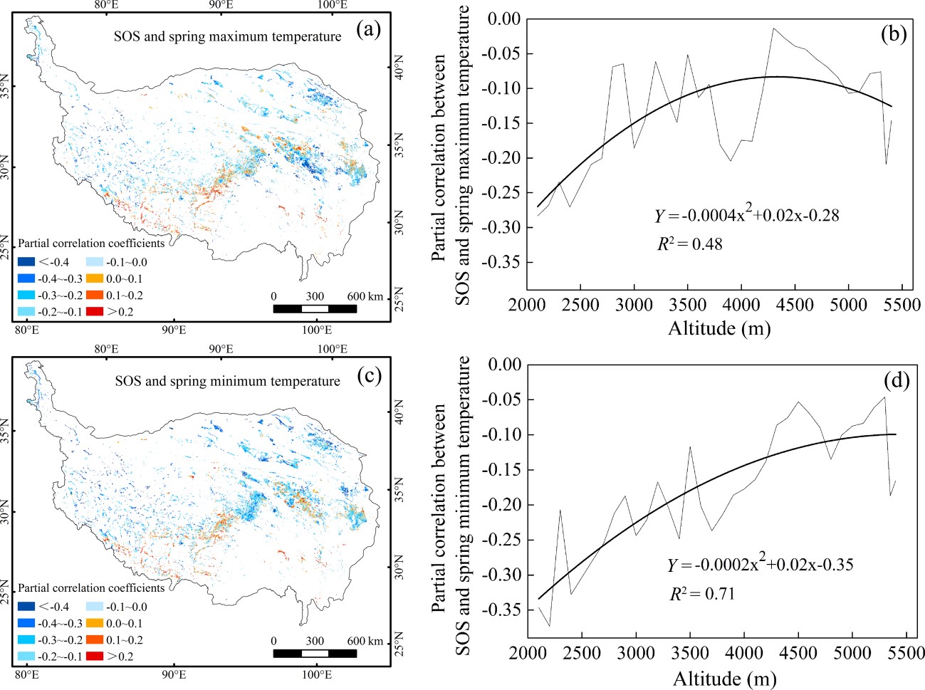 研究结果表明,青藏高原沼泽植被生长季开始期(SOS)呈显著提前趋势(约每十年提前3.4天),其中东部地区SOS提前最为明显。春季白天和夜晚增温会导致青藏高原沼泽植被SOS提前,但在不同海拔地区,白天和夜晚温度对沼泽植被SOS影响不同:在海拔4000米以下地区,青藏高原沼泽植被SOS主要受夜晚温度影响,而在4000米以上地区主要受白天温度影响。此外研究发现,在海拔4000米以下地区,随着海拔的升高,白天和夜晚增温对沼泽植被SOS的提前作用均逐渐减弱;在海拔4000米以上的地区,随着海拔的升高,白天增温对沼泽SOS的提前作用开始逐渐增强,而夜间增温对沼泽SOS的提前作用持续减弱且趋于平缓。研究指出,未来利用模型模拟青藏高原沼泽植被物候时,需考虑不同海拔地区沼泽植被物候对气候的不同响应,并强调在全球昼夜不对称增温背景下,还应充分考虑白天和夜晚温度对沼泽植被物候的不对称影响。研究结果为进一步了解青藏高原沼泽湿地植被动态,准确评估沼泽湿地生态系统功能提供了科学依据。