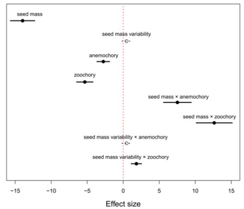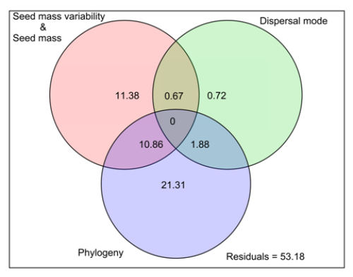图2 种子大小及其变异性、传播方式和系统发育对植物分布区大小的变异分解。