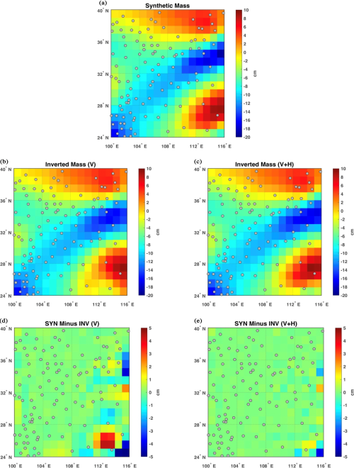 图1.对于模拟的同一质量分布(a),利用垂直方向和垂直+水平方向GNSS形变的质量反演结果分别为(b)和(c),模拟质量与反演质量之差分别为(d)和(e)。在东南角GNSS台站(圆点)稀疏的区域,附加水平方向形变有效提升了反演精度。