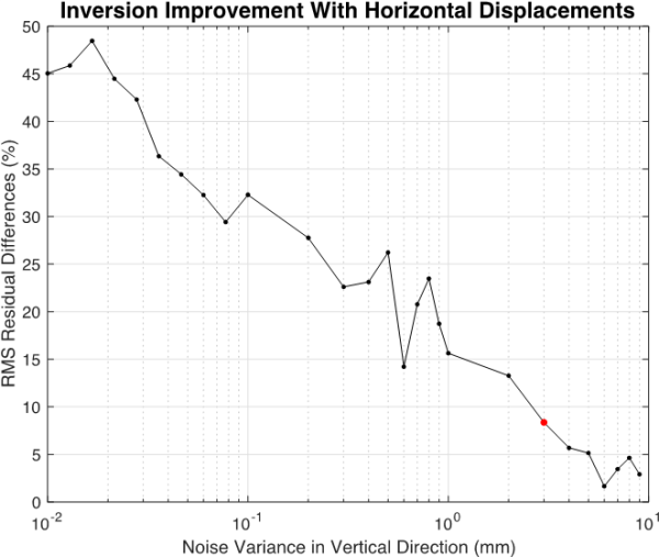 图2.GNSS观测精度与水平方向形变对质量变化反演的改进量关系图。红点所示为目前GNSS精度(以垂直方向时间序列的方差表示)下的改进量(约10%)