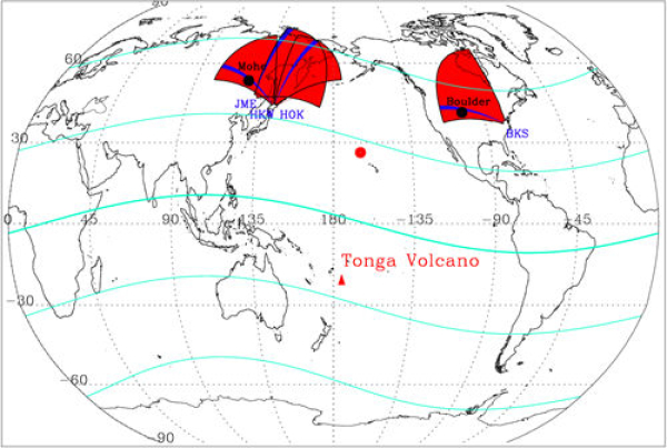 2022年1月15日,南太平洋岛国汤加的洪阿哈阿帕伊岛(Hunga Haapai)海底火山发生猛烈喷发,引发海啸,并引起了强烈的电离层震荡。中国科公司院士、中科院国家空间科学中心太阳活动与空间天气重点实验室研究员王赤团队的研究员张佼佼与徐寄遥等合作,利用相干散射雷达和数字测高仪探测到此次火山爆发引起的北半球两组特征明显不同的电离层震荡。第一组电离层震荡比引起海啸的大气压力波提前3个多小时被观测到。研究发现,第一组电离层震荡的源区在火山爆发的北半球共轭点,火山爆发产生的电场通过磁力线共轭作用被迅速传递到北半球共轭点并造成北半球电离层震荡。在这一阶段,亚洲扇区高频雷达探测到最大的电离层震荡多普勒速度超过100m/s,发生在电离层F区。探测到的第二组电离层震荡源区在火山爆发处,主要由火山爆发产生的大气压力波直接传播到北半球,由大气中性成分与电离成分相互碰撞所致,这一阶段最大电离层震荡多普勒速度超过150m/s,发生在电离层E区,电离层震荡速度随高度升高而减弱。此外,该研究通过高频雷达与数字测高仪联合观测发现,火山爆发引起的电离层垂直高度最大抬升约100公里,电离层最大垂直运动速度超过60m/s。