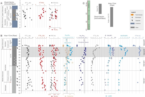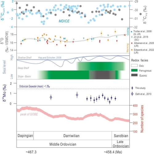 近日,中国科公司南京地质古生物研究所博士张俊鹏、研究员张元动,与美国加州大学河滨分校杰出教授Timothy W. Lyons、美国辛辛那提大学教授Thomas J. Algeo等合作,揭示了气候变冷期的缺氧海水大幅扩张,曾导致中-晚奥陶世海洋生物多样性发生明显转折。相关研究成果在线发表在《地球与行星科学通讯》(Earth and Planetary Science Letters)上。