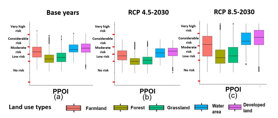 中国科公司城市生态格局、过程与规划研究组(唐立娜团队)以2013-2018年为基准年,应用卫星反演的闽三角城市群基准年PM2.5年均浓度数据和机器学习算法,构建PM2.5预测模型。结合未来不同RCP情景下的气候变化、土地利用规划信息和社会发展多源数据,科学预测了2030年闽三角城市群在不同RCP场景下1 km分辨率的年均PM2.5浓度分布,有效提高了生态风险研究基础数据的时空分辨率。在此基础上,叠加现有的PM2.5临界负荷指标和不同区域的PM2.5背景值,构建PM2.5污染超载指数(PM2.5 Pollution Overload Index,PPOI),刻画出闽三角城市群PM2.5污染生态风险的空间分布情况,促进了PM2.5污染生态风险时空变化研究的发展。