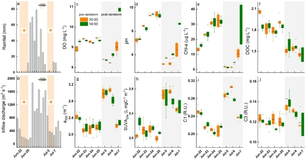 水库作为重要的水生态系统,其碳源汇动态对全球碳循环与碳收支有着重要影响。暴雨过程中微生物高代谢率以及来自上游有机物的持续输入和降解可能是水库碳排放的一个重要来源。暴雨会导致水温、溶解氧和水化学特征,尤其是溶解性有机物(DOM)来源组成发生巨大变化。这些参数通常在几个小时到几天内迅速波动,并显著影响二氧化碳和甲烷的产生和排放。然而,对水库水体理化参数和DOM来源组成的分析往往依赖于逐周、逐月、乃至逐季度的野外观测。