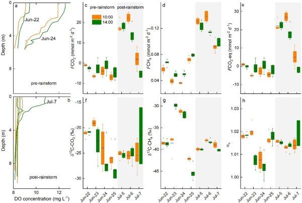 常规周期性监测手段往往无法捕捉到暴雨等偶发性事件发生发展规律,鉴于此,中国科公司南京地理与湖泊研究所张运林研究小组周永强等人在千岛湖上游新安江流域对暴雨事件前后水体理化性质和DOM来源组成的动态变化以及对碳排放的作用机制展开研究。利用DOM光谱和傅里叶变换离子回旋超高分辨率共振质谱(FT-ICR MS)等手段,揭示了暴雨事件前后DOM的来源组成,利用Picarrro碳同位素分析仪分析了暴雨前后甲烷和二氧化碳的稳定同位素组成,弥补了暴雨事件对水化学和DOM来源组成动态的影响以及对二氧化碳和甲烷的排放通量影响研究的空白(图1)。