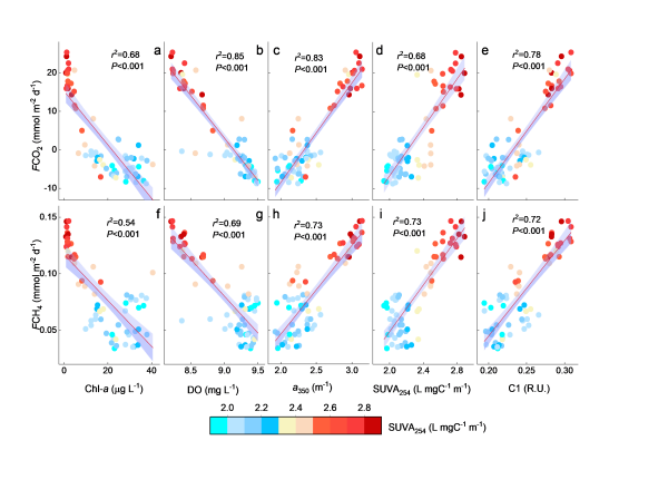 图4暴雨前后叶绿素、溶解氧、DOM吸收、比紫外吸收及陆源组分与二氧化碳、甲烷排放通量的关联性分析