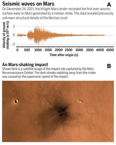 图1: A:流星体撞击火星产生的火震波。 2021年12月24日,“洞察”号火星着陆器记录到了一次流星体撞击事件,撞击产生的波形中观测到了面波信号。通过对这一火震信号进行分析,研究人员得到了不同于以往的火壳结构细节信息。B:流星体撞击火星产生的陨石坑。 来自火星轨道探测器的火星地表彩色图像显示了这一撞击事件产生的陨石坑,从陨石坑向外辐射的黑色条纹是由超音速撞击产生。