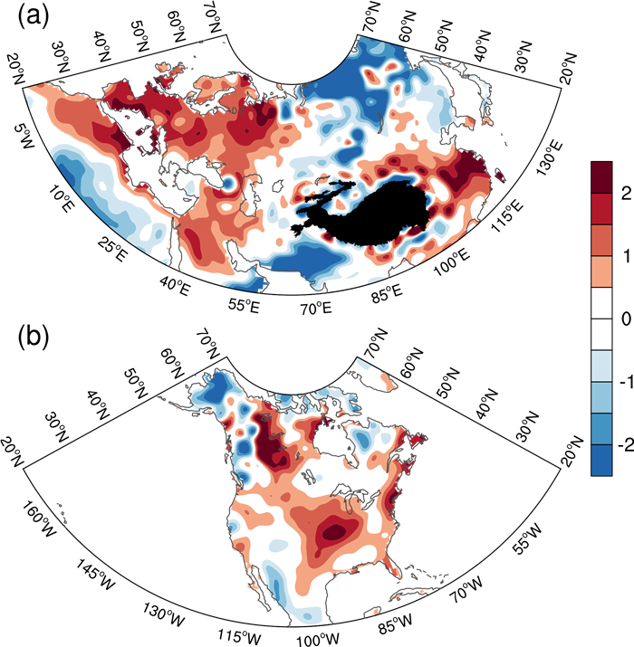 图1. 2022年夏季(a)欧亚大陆和(b)北美标准化的2米日最高气温异常分布。