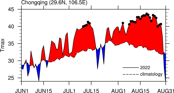图2. 重庆沙坪坝气象站日最高气温的逐日演变。实线和虚线分别对应2022年和1979–2022年的气候态平均。黑点标出高于40°C的天数。