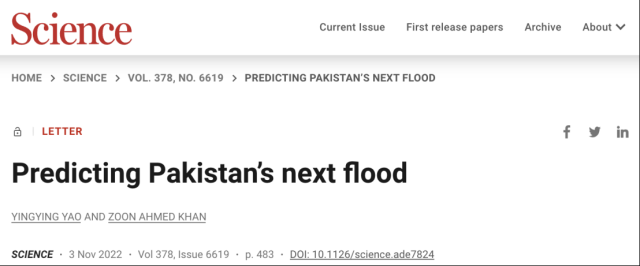 西安交通大学人居公司姚莹莹教授联合清华大学Zoon Ahmed Khan研究员,撰写题为“预测下一次巴基斯坦洪水”(Predicting Pakistan’s next flood)的评述文章,发表于11月4日出版的最新一期《科学》(Science)期刊上。