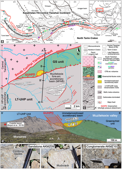 中国科公司院士、中科院新疆生态与地理研究所新疆矿产资源研究中心研究员肖文交团队,选取了位于南天山造山带阿克牙孜低温-超高压变质杂岩带中的一处弧前增生盆地(图1),开展碎屑锆石年代学及沉积大地构造演化研究,并结合区域上三大岩类的地球化学和年代学大数据汇总,系统梳理古亚洲洋西南缘的南天山洋闭合过程中沉积碎屑物源、壳-幔响应以及区域地球动力学格架之间的时空演化关系。