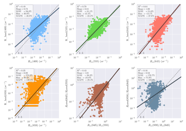 (1)MODIS陆地反射率产品(R_land)在全球水体显著高于实测遥感反射率(Rrs),在红光和绿光波段具备一定的精度(红光:MAPE="22%,绿光MAPE=37.6%),但在469nm和859nm精度较差(图2)。全球的评价结果与之前在太湖和Chesapeake湾的评价结果相似(Feng" et al. 2018. WRR)。对比于传统短波红外水色大气校正方法(Rrs_SWIR),R_land亦出现高估,并且二者在空间上出现不一致,R_land在浑-清水界限时存在“突变”现象。