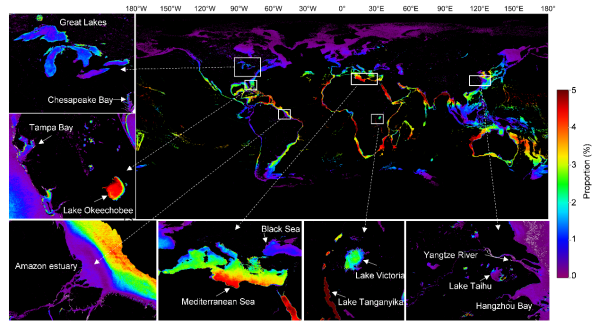 不同于开阔大洋,近海岸和内陆水体(湖库、河流)相对较为浑浊,因此,MODIS等数据的陆地反射率产品近年来被用于监测湖泊蓝藻水华、透明度和浊度,但却鲜用于观测叶绿素a、藻蓝素、CDOM等研究。至今,有关MODIS陆地反射率的两个基础问题尚不明确:一是MODIS等陆地反射率产品在全球近岸和内陆水体的精度究竟如何?是否可靠?二是MODIS陆地反射率可被用于观测哪些水色参数?