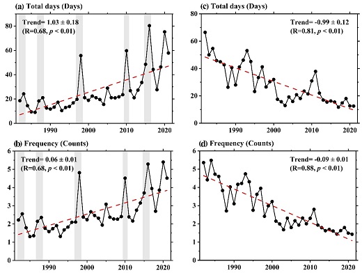 图1 1982-2021年全球珊瑚礁区域海洋热浪(a, b)和海洋冷浪(c, d)指数的年均变化,红色虚线表示线性趋势,阴影表示强厄尔尼诺年